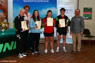 36.DKT Herren C - Sascha Treinen trumpft aufEine starke Vorstellung von Sascha, der je länger die Konkurrenz ging, um so stärker wurde.Ein kleiner Wermutstropfen war das Aufgeben seines Mannschaftskameraden Oliver Bastian, der in dieser Konkurrenz gleichfalls ganz vorne zu erwarten gewesen war, doch durch eine Erkältung geschwächt nach den schweren Spielen in der Herren B diese Konkurrenz vorzeitig abbrechen musste. Dafür rückten dann andere in den Mittelpunkt. So ein starker Christoph Schumacher, der Florian Thome im Viertel- und Jonas Langer im Halbfinale bezwingen konnte. Alexander Reckers, der sehr souverän auf seinem Weg ins Halbinfale wirkte und gegen Robert Begri ein wirklich gutes Spiel im Viertelfinale ablieferte, Sascha Treinen ein um das andere Mal in der Vorschlussrunde in Bedrängnis brachte, gegen dessen wuchtige Angriffsbälle aber dann doch nach 4 Sätzen kapitulieren musste. Ebenso dürfen die anderen Viertefinalisten Ralf Heib und Michael Kall nicht unerwähnt bleiben. Sich in diesem schwerem Feld bis dorthin vorzukämpfen ist allein schon eine Auszeichnung. Im Finale merkte man beiden Kontrahenten an, dass sie einen wirklich guten Tag erwischt hatten, sehr viele Bälle von Christoph und Sascha fanden ihr Ziel und es gab sehenswerte Ballwechsel zu bestaunen. Insgesamt ein sehr gutes Finale, da beiden Spielern wirklich viel gelang und ihre Spielweise zu einem sehr guten Spiel ergänzten. Sascha überstand den kleinen Schreckmoment gegen Ende des vierten Satzes, als ihm wie Oliver zuvor die Belastung des Turniers zu schaffen machte und die Obermuskulatur verkrampfte. Christoph wartete, ganz der faire Sportsmann, bis es wieder bei Sascha ging und wie dieser sich dann auch gegen Ende des Spiels zusammen riss, da hatte er einfach den Titel verdient.