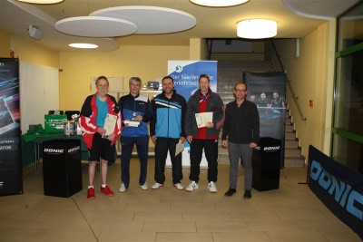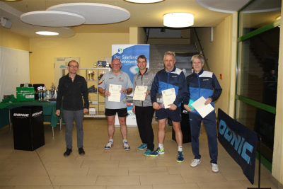 Andreas Koch und Volker Schramm werden Favoritenrolle gerecht23 Doppel bunt gemischt aus allen Konkurrenzen dieses Tages traten an, um in entspannter Atmosphäre gemeinsam unsrem Sport nachzugehen. 23 Doppel, ein großer Favorit und dennoch machte es viel Spaß.Der Drittplatzierte der Ü40 Saarlandmeisterschaften, Oliver Becker trat mit Martina Frisch als Erstes gegen die so eingespielte Besseringer Kombinantion an, beide gaben ihr bestes und hatten dennoch die notwendige Lockerheit, um so ein Doppel auch genießen zu können. Timo Michaely-Mahren und Axel Stierle waren dann schon eine echte Klippe für Andreas und Voker, welche diese aber souverän umschiffen konnten. Im Halbfinale zeigten die hoch dekorierten Alois Heinrich und Edmund Kreuz, warum sie auch im fortgeschrittenen Alter noch solch klasse Tischtennisspieler sind, ertrotzten sich einen Satz und machten es den späteren Sieger so richtig schwer ins Finale zu kommen. Im unteren Tableau erwuchs ihnen mit Christian Hinke und dem wieder erfreulich fitten Hermann Hanser ein ernstzunehmender Gegner. In einem packenden Viertelfinale schlugen sie nicht nur Siegmar Mathieu und Timo Endres in vier Sätzen, sondern mit dem gleichen Ergebnis im Halbfinale auch Guido Herlert und Thomas Scherer, die davor die mitfavorisierten Bernd Schuler und Andreas Welter bezwingen konnten.