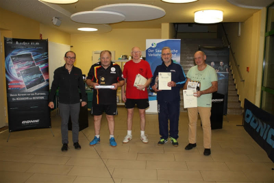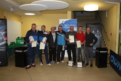 Andreas Koch mit zweitem EinzelerfolgWie stark die Einzelerfolge von Andreas und Bernd in ihren Altersklassen einzuordnen sind, zeigt sich schon daran, dass beide auch bei den wesentlich jüngeren Senioren das Finale erreichten. Man muss es sich wirklich vorstellen, Bernd wurde schon 30 als die jüngsten Senioren gerade geboren wurden.In der umkämpftesten Gruppe erwischte es leider Ralf Landry, der nur aufgrund des schlechteren Satzverhältnisses Richard Meiers und Andreas Geiss den Vortritt lassen musste. Im Achtelfinale musste lediglich Richard Meiers gegen Peter Hettinger über die volle Distanz und musste das im Viertelfinale gegen den erneut überzeugenden Andreas Welter noch einmal wiederholen, um sich im Halbfinale Andreas Koch gegenüber zu sehen, der davor Manfred Jochem, den Sieger der Ü60, aus der Konkurrenz geworfen hatte. Im Semifinale hatte Andreas so seine liebe Mühe und Not mit Richard, war letztlich aber verdienter Sieger in einem packenden Spiel. Als einziger Ü40 erreichte Christian Hinke das Halbfinale. Auf dem Weg dorthin bezwang er zuerst Martin Dörrenbächer und dann Axel Stierle, der seine gute Form mit einem Sieg über den gut zu gefallenden Timo Endres unter Beweis stellte. Bernd Schuler gab auf seinem Weg ins Halbfinale jeweils einen Satz gegen Andreas Geiss und dann Timo Michaely-Mahren ab, die beide nicht die Konstanz in ihren Waffen fanden, um Bernds unglaublich hoher Präzision beizukommen. Christian legte im Halbfinale gegen Bernd sein Trauma vor zwei Jahren ab. Dort war er im Finale völlig chancenlos gegen Bernd geblieben, was er auch offen zugab. In diesem Jahr hatte er eine echte Chance, es reichte am Ende nur zu einem Satz für ihn, doch Christian war es gelungen, ein Spiel auf Augenhöhe daraus zu machen, was aller Ehren wert ist. Es bedurfte also schon eines Andreas Kochs, um Bernds doppelten Titelhattrick aus den letzten drei Turnieren zu verhindern. Es war das erste Einzel, welches Bernd seit drei Jahren bei uns verloren hat und es war uns ein Fest, das Können dieser beiden großen Tischtennisspieler, im Kreise von so vielen Könnern ihres Fachs, bewundern zu dürfen.