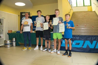 Keines der Spiele ging über fünf Sätze, so dass im Viertelfinale alle noch im vollen Saft standen. In der Vorschlussrunde ließ der ältere Jahrgang seinen jüngeren Kontrahenten noch einmal abblitzen. Sebastian bezwang einen sich immer besser ins Turnier spielenden Sascha und Leonard hatte gegen den spielfreudigen Mathis nochmals die besseren Antworten. Knapp, sehr knapp sogar ging es dann im Finale zu. Sebastian gewann den ersten Satz, Leonard ging dann in Führung, bevor es zum Satzausgleich und in den Entscheidungssatz kam. Dort spielten beide groß auf und am Ende durfte sich Leonard mit 16:14 über den Turniersieg freuen.