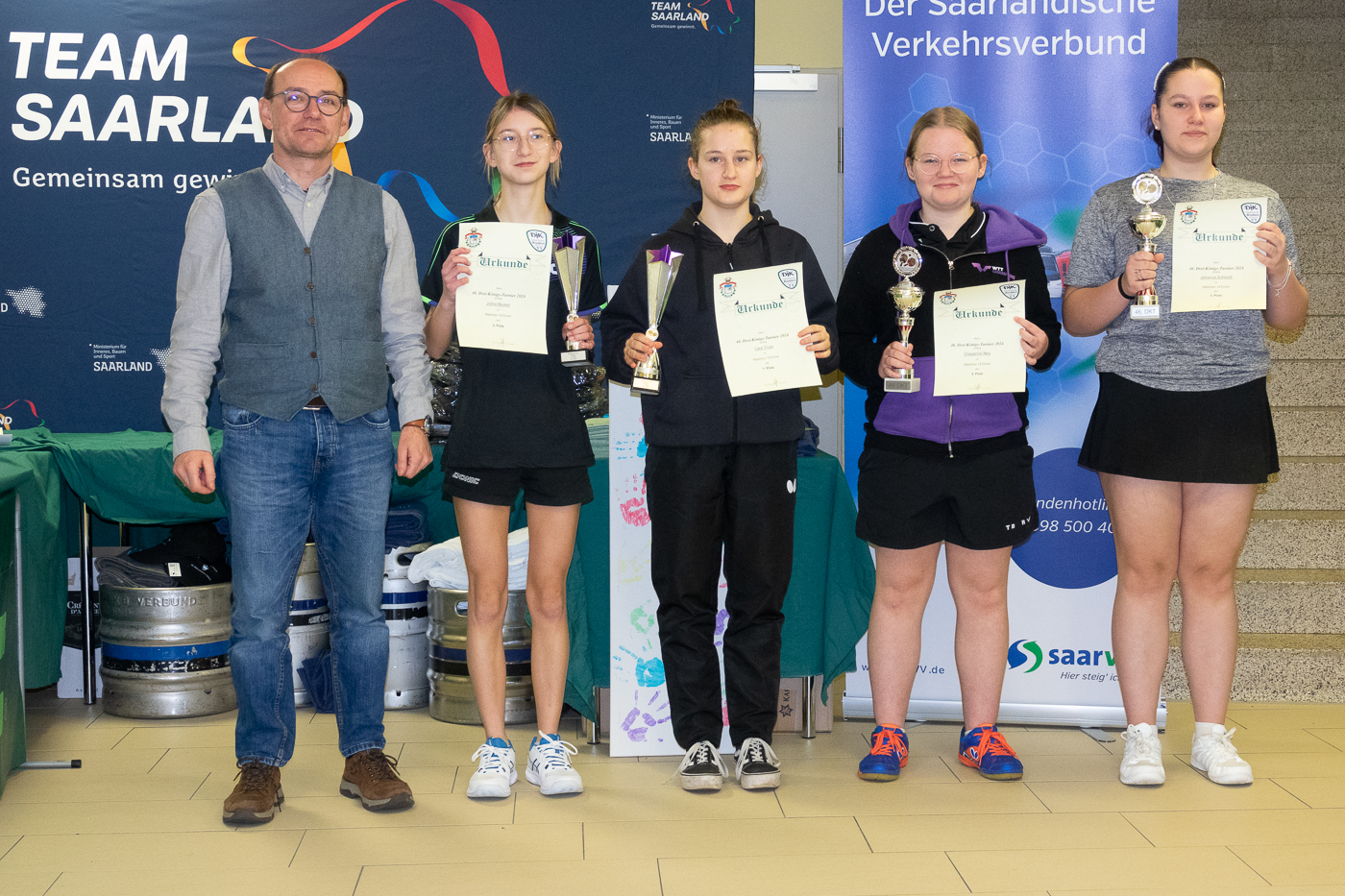 eine gute Grundlage schaffen für das spätere Halbfinale.Auf den Plätzen 3 der jeweiligen Gruppe landeten Zoe Nola (TuS Bliesransbach) und Jennifer Bach (TTC Ensdorf) mit je einem Sieg, was Elisabeth Zimmermann (TuS Wörschweiler) und Charlotte Müller (TV Quierschied) auf den vierten Plätzen diesmal verwehrt blieb. Keine Überraschungen auch im Gruppenkopf, wenngleich Cheyenne Ney (TTC Altenwald) und Johanna Schmidt (TuS Wörschweiler) den Gruppensiegerinnen Lara Truar (TTSV Fraulautern) und Jolina Becker (DJK Ottweiler) zumindest einen Satz abnehmen konnten. Lara konnte anschliessend das Halbfinale klar mit 3:1 Sätzen gegen Johanna gewinnen, Cheyenne schaffte es in der Neuauflage des Saarlandmeisterschafts-Viertelfinale erneut in den 5. Satz gegen Jolina, musste aber wieder knapp mit 2:3 diese ins Finale lassen. Auch das Finale war ein Deja-vu-Spiel der Saarlandmeisterschaften. Musste bei den Landes-Titelkämpfen Lara noch beim 3:1 einen Satz ihrer Gegnerin überlassen, so hielt sie sich diesmal gegen Jolina schadlos und siegte souverän und verdient in der Konkurrenz Mädchen U19. Platzierungen 1. Lara Truar (TTSV Saarlouis-Fraulautern) 2. Jolina Becker (DJK TT Ottweiler) 3. Cheyenne Ney (TTC Altenwald) 3. Johanna Schmidt (TuS 05 Wörschweiler) Ergebnisseite der Mädchen U19 beim 46.Drei-Königs-Turnier (Gruppenphase) Ergebnisseite der Mädchen U19 beim 46.Drei-Königs-Turnier (KO-Phase) |