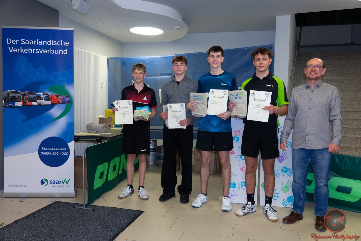 Das hat es so noch nicht gegeben in sage und schreibe achtzehn Jahren beim saarVV-Cup. Zwar hat schon mehrfach ein Doppelpartner mit einem wechselnden Partner den Titel öfter als einmal gewinnen können, dass aber Zweie im Jahr nach dem Titelgewinn sich erneut gemeinsam der Konkurrenz stellen und diese dann auch auf die Plätze verweisen, das ist tatsächlich ein Novum in unserer Turniergeschichte.Exakt 32 Doppel meldeten und damit 64 Spielerinnen und Spieler U19, rund 30 Prozent mehr als im letzten Jahr, was sehr für die Beliebtheit des saarVV-Cup mit seinen Medienpreisen spricht. Gleich in Runde eins ging es in drei Partien heiß her bis in den fünften Satz, beispielsweise bei der Partie von Hannah Becker (DJK Ottweiler) und Mahmoud Ramou (DJK Heusweiler), die Simon Woll und Gabriel Bock (beide TTC Hülzweiler) zugelost bekamen. Dreimal Verlängerung, kein Satz mit mehr als zwei Punkten Unterschied, ein wahrer Fünfsatzkrimi. Simon und Gabriel führten bereits 2:0, doch Hannah und Mahmoud glichen aus, um letztendlich doch das Hülzweilerer Duo mit 11:9 in die 2. Runde zu schicken. Ähnlich schafften auch Leni Heckel und Gent Lippe (beide TTC Berus) sowie Johann Willems (ETuS Konz-Karthaus 09) und Lars Edenburg (TG Konz) ihr Erstrundenmatch in knappster Manier durch Siege im 5. Satz. Das Achtelfinale konnten bis auf ein gesetztes Doppel alle anderen siegreich gestalten, wenngleich Paul Gurti und Luuk Schreiner (beide ATSV Saarbrücken) das mit einem 3:2 Sieg über die Rodener Paarung Felix Sonntag und Nils Uhde auch nur äusserst knapp schafften. Einzig die beiden Konzer Johann und Lars patzten, mussten Yannis Schank und Adrian Schwender (beide TV 06 Limbach) ins Viertelfinale einziehen lassen. Während in der unteren Turnierhälfte TOP-2-Doppel Marwin Rehmer (TTC Dörsdorf) an der Seite von Maximilien Thiel (ETuS Konz-Karthaus 09) dreimal zu Null siegten und erst im Halbfinale von Albert Simon (TT Schaumberg Tholey) und Elias Uhde (DJK Saarlouis-Roden) durch zumindest einen Satzverlust so etwas wie Gegenwehr verspürten, verlief das im oberen Tableau schon ein wenig komplizierter. Die Titelverteidiger des 17. saarVV-Cup Arman Aghababa (TTSV DJK Bous) und Sebastian Sonnenburg (TTV Reisbach) legten zweimal 3:0 vor, doch schon im Viertelfinale vermochten es Maximilian Wendling und Matthias Mahren (beide DJK Saarlouis-Roden) ihnen ordentlich Paroli zu bieten. Spätestens nach diesem Warnschuss war klar, Mission Titelvereidigung geht nur über ganz viel Willen und mit einer Top-Leistung, die -zugegebenermassen- bei einem gesundheitlich angeschlagenen Arman naturgemäss ihre Grenzen hatte. Das 3:2 nach Satzrückstand gegen das Hülzweilerer Duo Jean-Luca Schröder und Luca Fery, von nicht wenigen als Geheimfavorit gesehen und zurecht ja auch auf einer mittleren Setzposition, war aber wohl der Akt des Willens, den Arman und Sebastian benötigten, um das Finale und die Chance auf die Titelverteidigung anzunehmen. In ähnlicher Manier wie im Halbfinale schnappten sie sich Satz 1 und liessen Marwin und Maximilian zum 2:1 vorbeiziehen, besannen sich ihrer Stärken und holten den Sieg nach 11:8 und 11:6. Eine starke und proppevolle Konkurrenz, ein würdiger 18. saarVV-Cup, der Lust auf mehr macht. Arman und Sebastian dürfen sich dabei nicht nur über ihren verteidigten Titel freuen, mit jeweils drei gewonnenen saarVV-Cup Trophäen führen die beiden auch die ewige saarVV-Cup-Siegerliste an. Schönen Dank an alle 64 Teilnehmenden, das hat so richtig Spaß gemacht und war eine echte Werbung für den Tischtennis-Jugendsport. Platzierungen 1. Aghababa, Arman / Sonnenburg, Sebastian (TTSV DJK Bous / TTV Reisbach) 2. Rehmer, Marwin / Thiel, Maximilian (TTC Dörsdorf / ETuS Konz-Karthaus 09) 3. Schröder, Jean-Luca / Fery, Luca (TTC Hülzweiler / TTC Hülzweiler) 3. Simon, Albert / Uhde, Elias (TT Schaumberg Theley / DJK Saarlouis-Roden) Ergebnisseite des 18. saarVV-Cup beim 47.Drei-Königs-Turnier Finale des 18. saarVV-Cup im Youtube-Channel der DJK Roden Abt.TT |