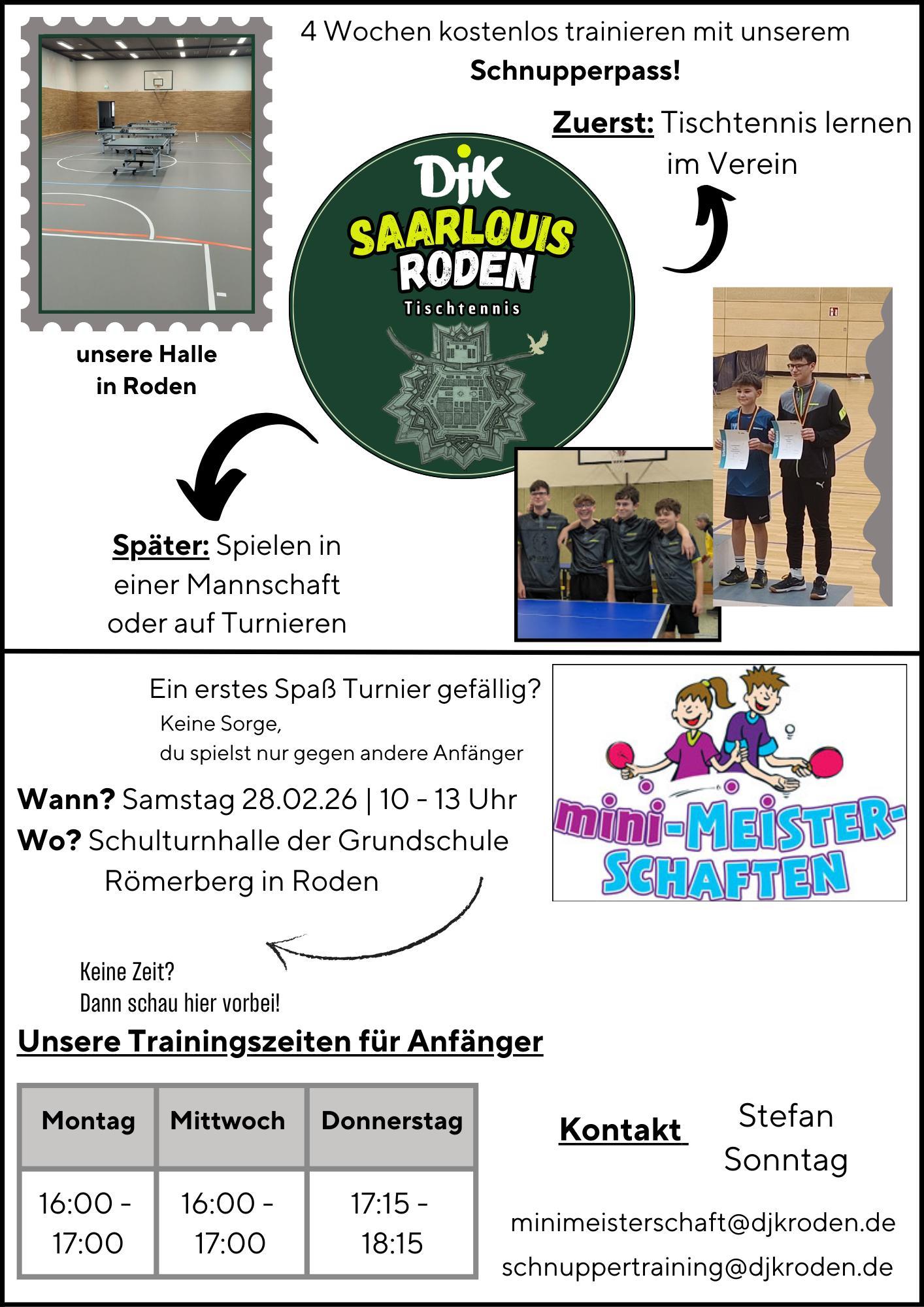An alle Vereinsmitglieder über 16 Jahre !Hiermit möchten wir Euch recht herzlich zu unserer diesjährigen Mitgliederversammlung der Tischtennisabteilung einladen. Sie findet statt am Freitag, 27. März 2026 um 18.00 Uhrim DJK-Raum (Donatuszentrum), Schulstrasse 7, 66740 Saarlouis-Roden.Tagesordnung:1. Eröffnung & Begrüßung2 Tätigkeitsberichte des Vorstandes 3. Bericht der Kassenprüfer 4. Aussprache zu den Punkten 2 und 3 5. Wahl eines Versammlungsleiters 6. Entlastung des Abteilungsvorstandes 7. Verschiedenes 8. Schlußwort Bitte gestalte Deinen Verein mit und nimm an der Versammlung teil. Einladung zur Abteilungsmitgliederversammlung der Tischtennisabteilung Am Sonntag, 29. März 2026 findet um 11 Uhr im Pfadfinderheim Saarlouis-Roden die Mitgliederversammlung des Gesamtvereins statt, zu der wir hiermit auch herzlich einladen: Einladung zur Jahreshauptversammlung der DJK Roden (Basketball, Darts, Handball und Tischtennis) mehr...