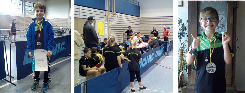 Im Einzel schaffte Julian Helfen einen Sieg und beendete seine Gruppe auf Platz drei. Leider reichte das nicht für den Einzug ins Viertelfinale, Julian darf aber auf die gezeigte Leistung stolz sein. Besser lief es für Matthias Mahren. Er muste in einer Fünfergruppe ran, was ein Weiterkommen ob der zusätzlichen Konkurrenz natürlich erschwerte. Doch Matthias spielte prächtig auf und konnte als Gruppenzweiter ins Viertelfinale einziehen. Da war dann gegen Marius Lorang von der TTG Fremersdorf-Gerlfangen irgendwie die Luft raus, Matthias hatte durchaus Siegchancen beim 1:3 und Satzbällen in zwei verlorenen Sätzen. Am Ende gewann mit Marius aber der Spieler, der über die gesamte Distanz klarer und zielstrebiger agierte. Mit dem erspielten 5.Platz darf Matthias aber auch sehr zufrieden sein. Felix Sonntag hatte bei der Auslosung Albert Simon in der Gruppe, den späteren Sieger und Topfavoriten des Turniers. Felix erspielte sich in den beiden ersten Einzeln zwei hauchdünne Siege und musste nur gegen Albert das Spiel abgeben. Somit zog er völlig überraschend in die Runde der besten Acht ein und muss sich nach dem Viertelfinal-Aus gegen Luca nicht grämen, der 5.Platz im Turnier ist ein toller Erfolg und möglicherweise sogar die Qualifikation für die Landesmeisterschaften. Um den Erfolg zu unterstreichen wurde kurzerhand zuhause nochmal schnell nachgearbeitet und Felix auch eine Medaille gebastelt, worüber er sich auch sehr freute.